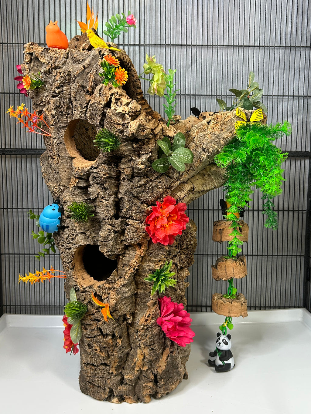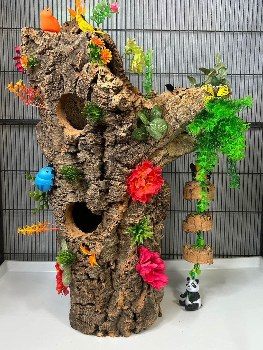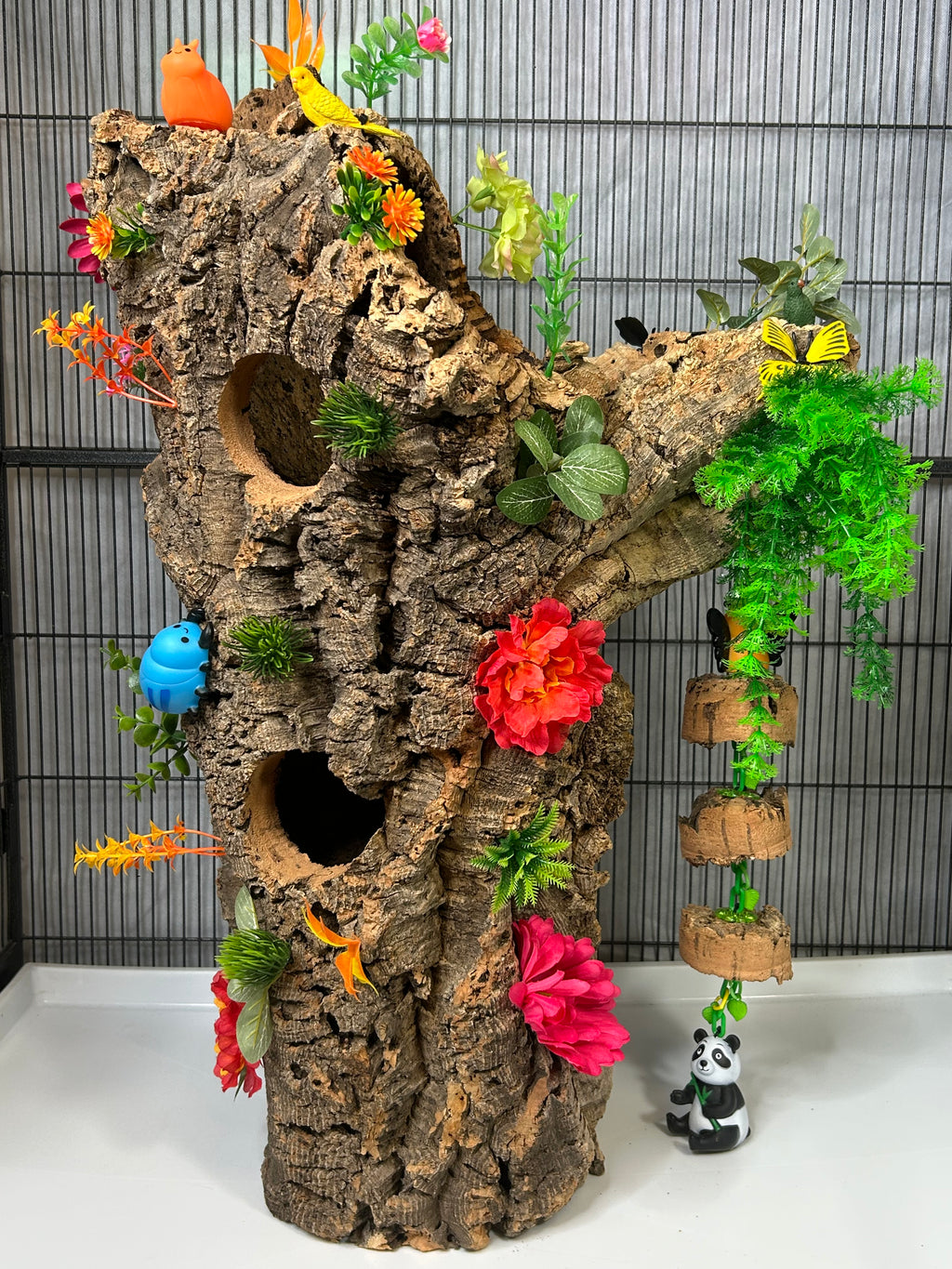 Bring the beauty of the wild right into your glider’s home! Handcrafted from natural cork, this enchanting hideaway bursts with vibrant greenery and floral accents, creating the feel of a lush temperate forest. Playful parrots and a cuddly panda add a whimsical touch, while the built-in swing gives your sugar gliders endless enrichment and fun. Perfect for hiding, climbing, and exploring, this unique piece combines cozy comfort with a magical forest adventure!