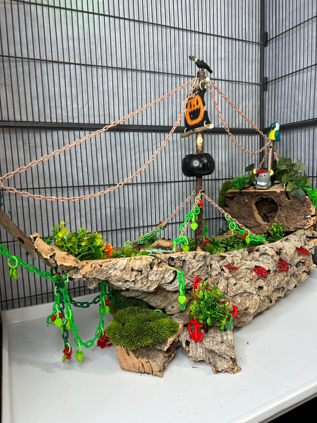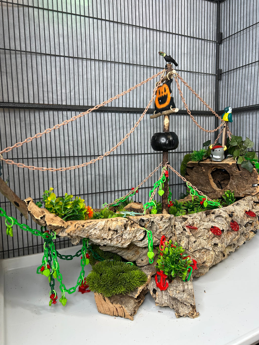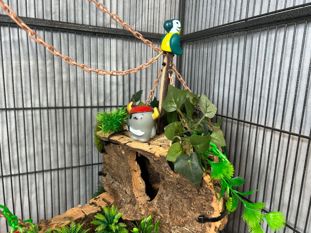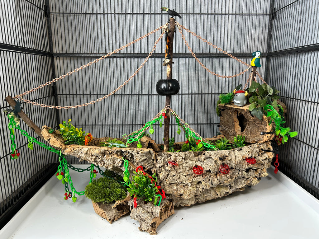 Set sail into mystery with this one-of-a-kind cork masterpiece! The Forgotten Galleon is a haunted pirate ship thatâs been shipwrecked, abandoned, and overtaken by creeping greenery. Carefully crafted from multiple cork pieces fixed together, this highly detailed hideaway brings eerie Halloween vibes straight to your sugar gliderâs home. Every angle tells a story of a vessel thatâs seen better daysânow transformed into an adventurous playground.