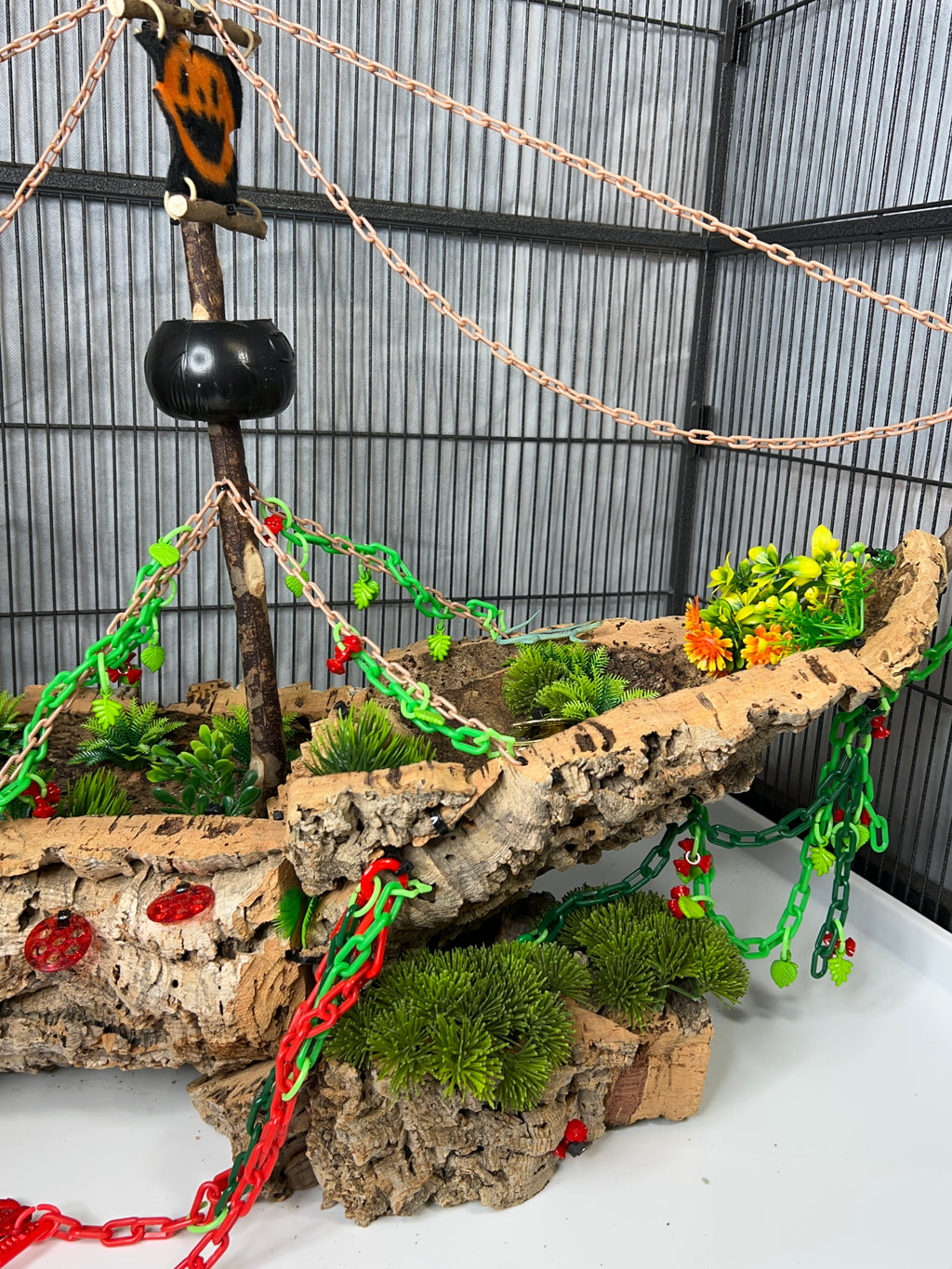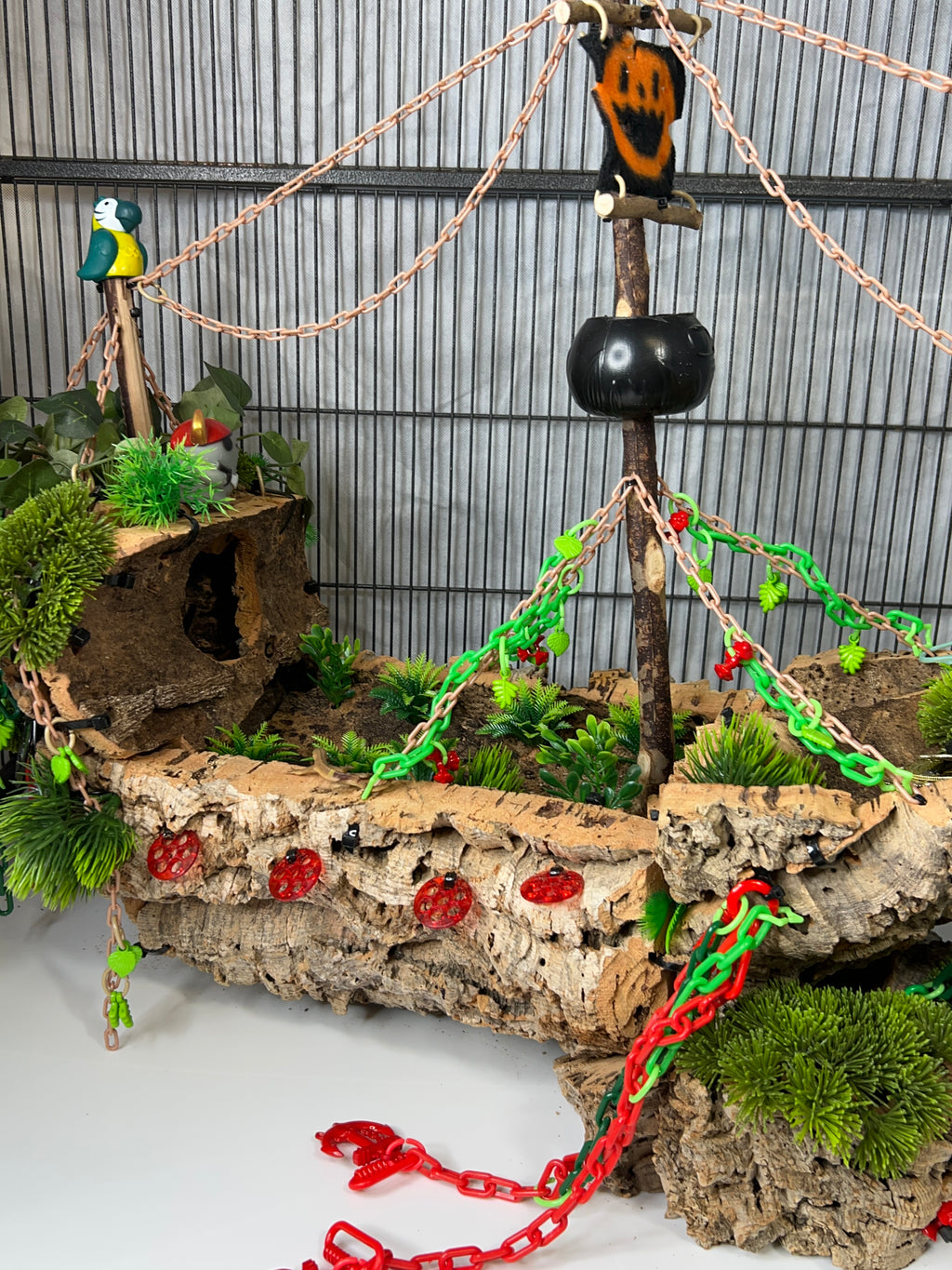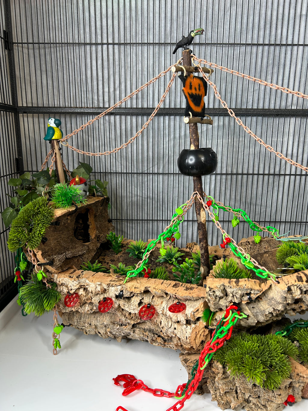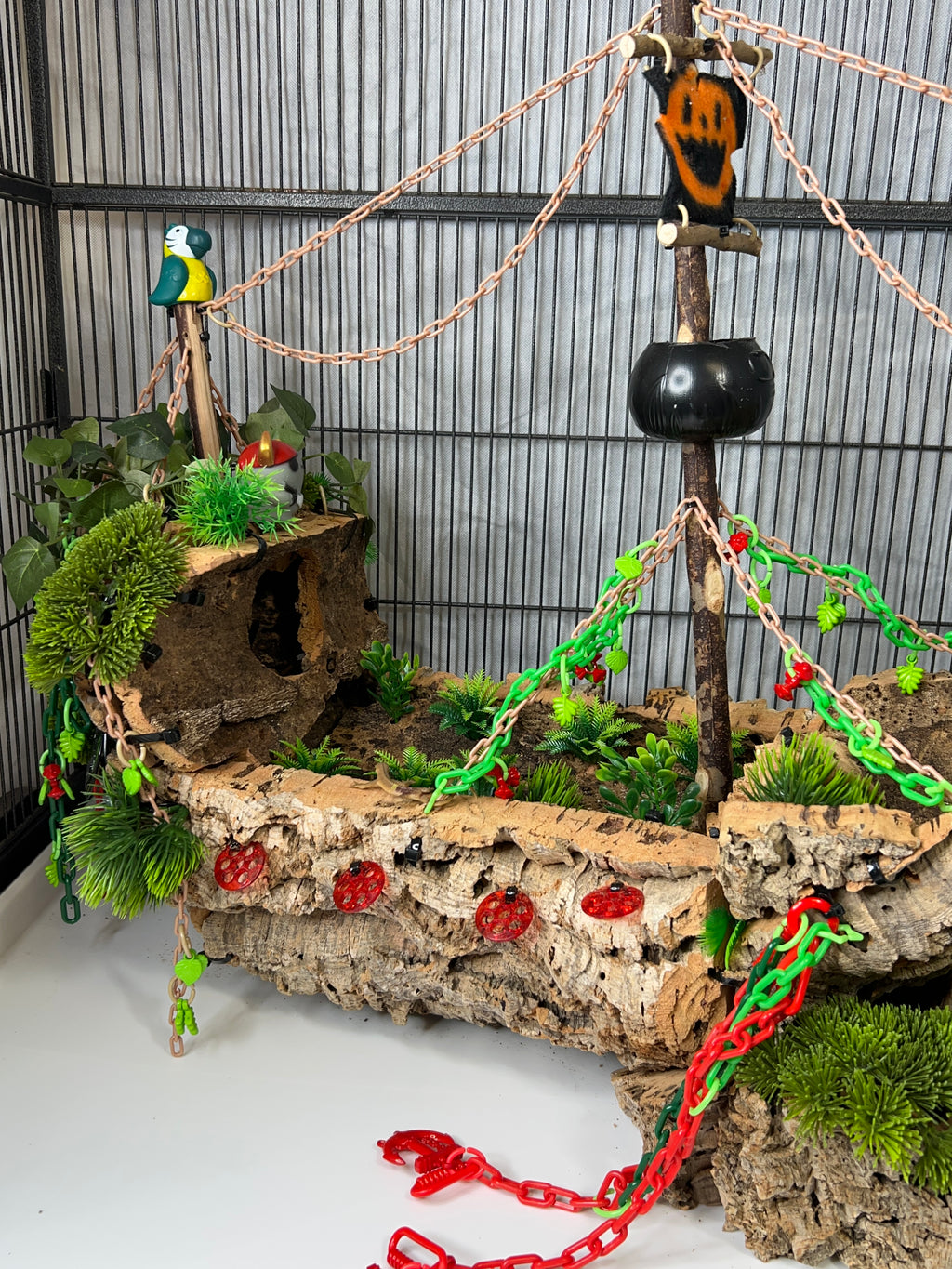 Set sail into mystery with this one-of-a-kind cork masterpiece! The Forgotten Galleon is a haunted pirate ship thatâs been shipwrecked, abandoned, and overtaken by creeping greenery. Carefully crafted from multiple cork pieces fixed together, this highly detailed hideaway brings eerie Halloween vibes straight to your sugar gliderâs home. Every angle tells a story of a vessel thatâs seen better daysânow transformed into an adventurous playground.