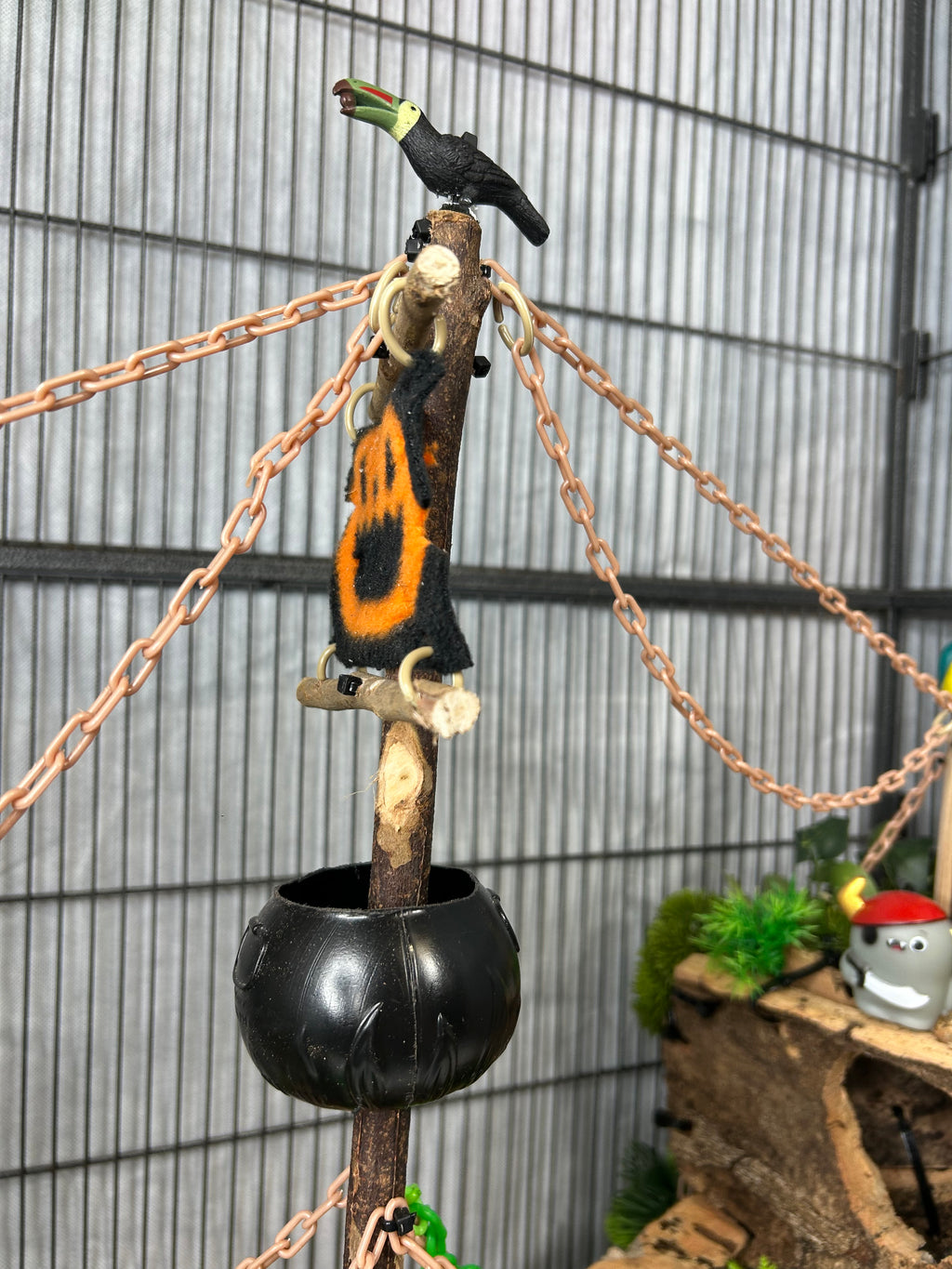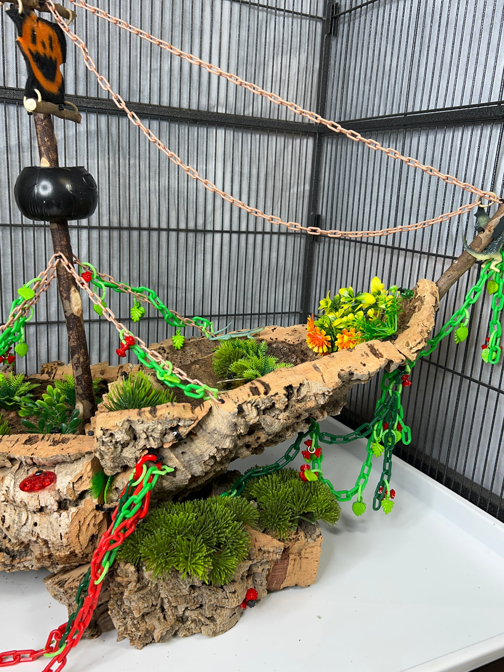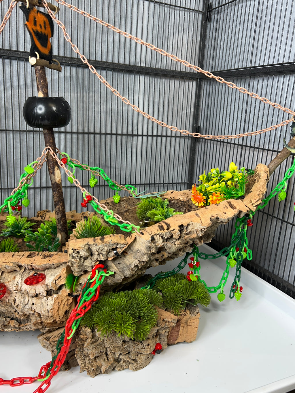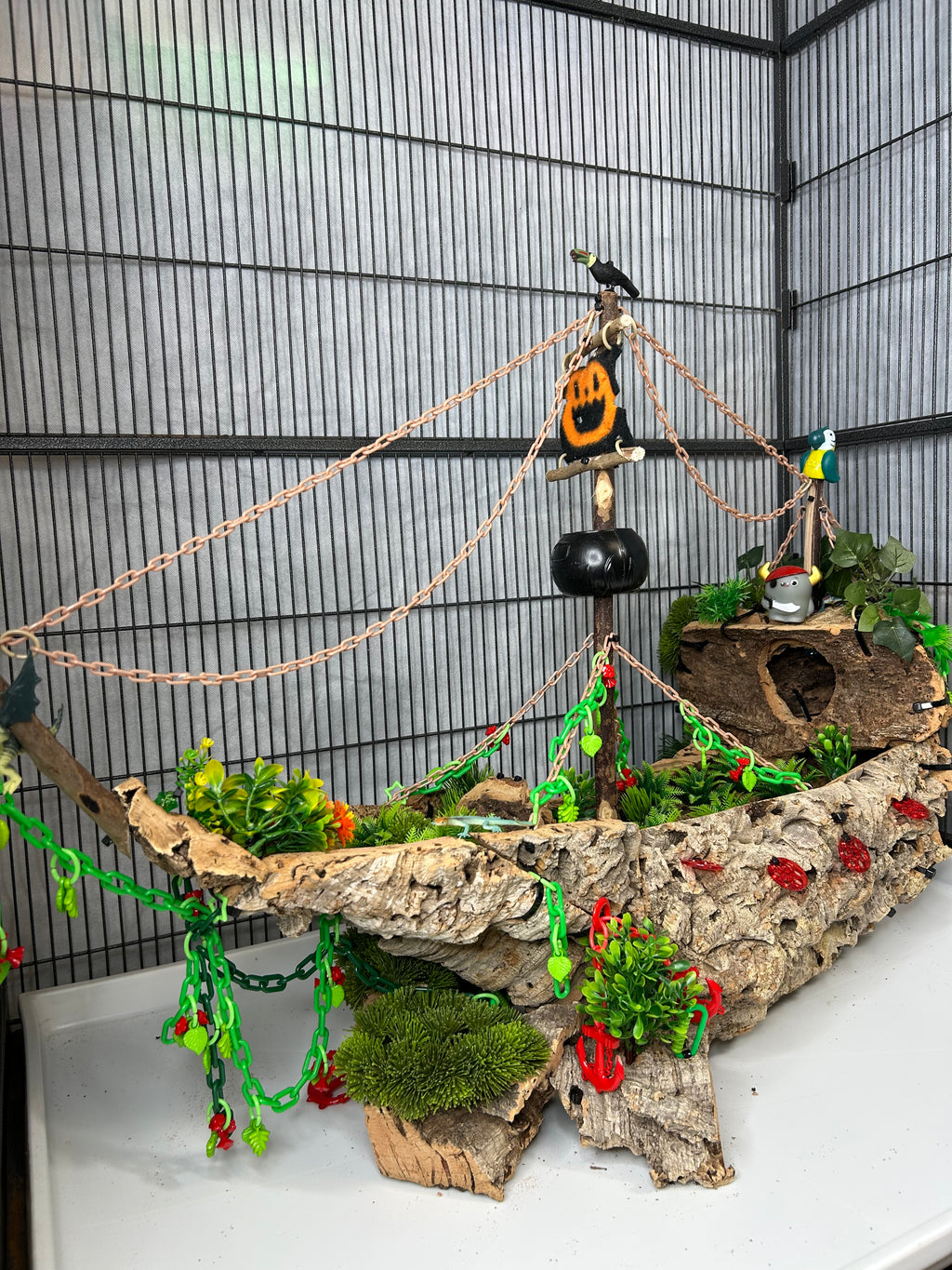 Set sail into mystery with this one-of-a-kind cork masterpiece! The Forgotten Galleon is a haunted pirate ship thatâs been shipwrecked, abandoned, and overtaken by creeping greenery. Carefully crafted from multiple cork pieces fixed together, this highly detailed hideaway brings eerie Halloween vibes straight to your sugar gliderâs home. Every angle tells a story of a vessel thatâs seen better daysânow transformed into an adventurous playground.