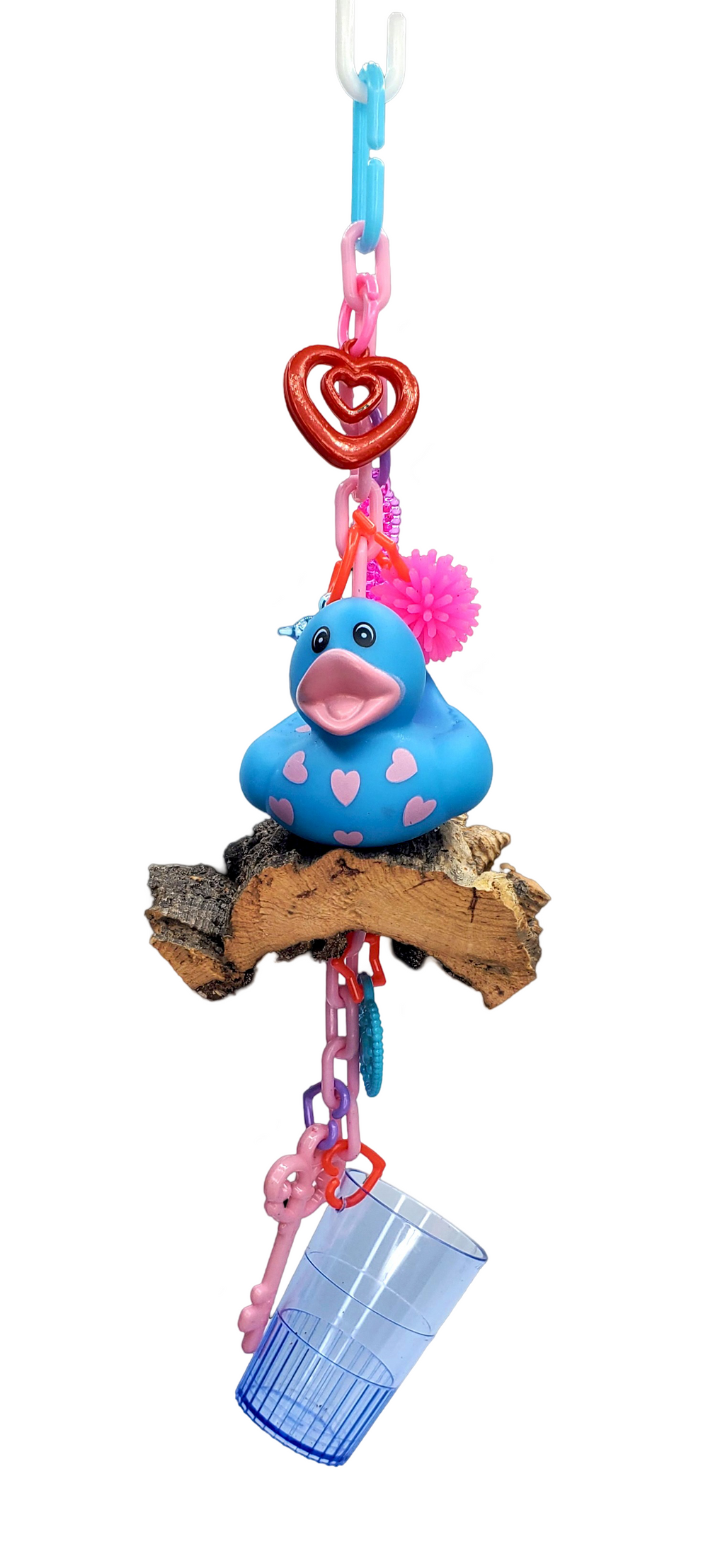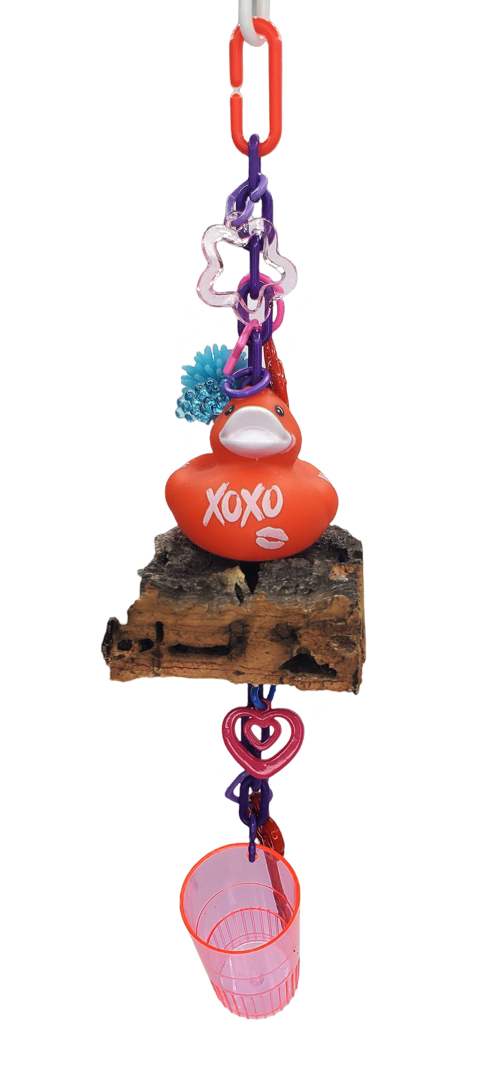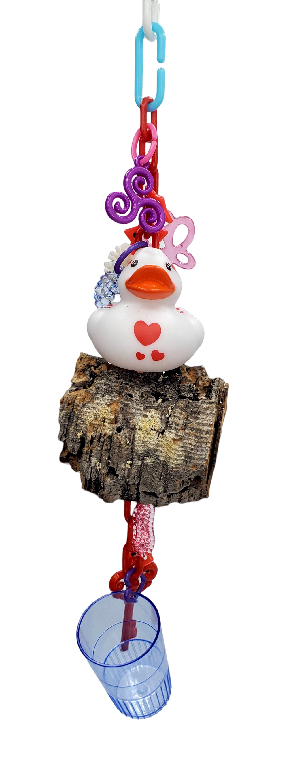 Celebrate the season of love with our Lovely Ducky Cork Critter toy! Featuring adorable rubber duck toppers dressed in festive heart designs, this charming toy adds a sweet touch to your gliders' cage. Just like the classic Cork Critter, it includes a cork base, a foraging cup, and an array of colorful chains and dangling charms for extra fun and entertainment. This unique toy is perfect for sprucing up your cage and giving your gliders a heartwarming playtime experience. It’s the ideal way to share the love with your gliders this Valentine’s Day!